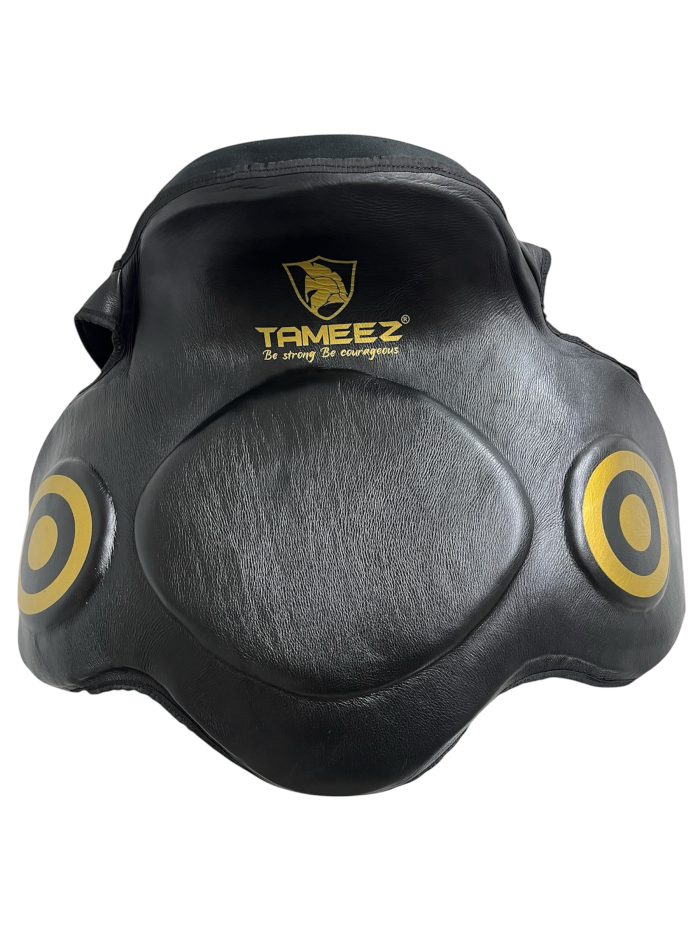 Жилет на тело полностью защищает тренера, закрывая грудь, живот, пах и бока.Верх жилета – защита корпуса TAMEEZ имеет загиб наружу для уменьшения риска попадания от удар ногой по лицу.В основных ударных зонах защитного жилета вшиты дополнительные 1 см вставки.Жилет для тренера TAMEEZ изготовлен из натуральной кожи с использованием жесткого многослойного наполнителя.